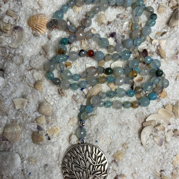 Chalcedone, Achate und Aquamarine in einer wunderbaren Komposition, teils facettiert, teils glatt geschliffen, geben sie dieser Mala einen sehr edlen und dezenten Hauch von Luxus. Sie liegt sehr weich in der Hand durch den Schliff. Ein versilberter Lebensbaum und ein versilbertes Emblem im Nacken ergänzen das Unikat.